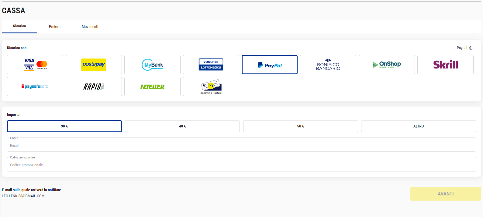 ATTENZIONE: Prima di effettuare la ricarica del Conto Gioco con PayPal verifica: