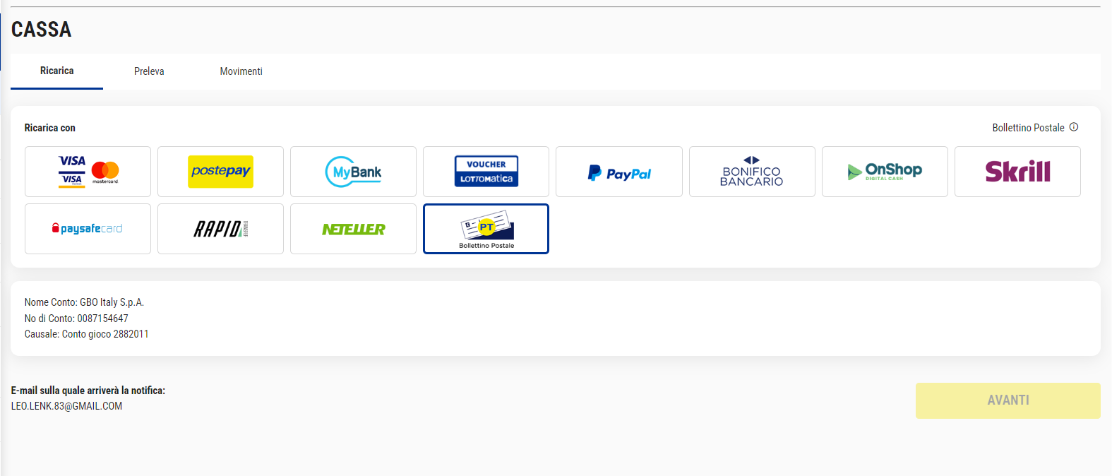 Si aprirà la schermata dove potrai selezionare, tra i vari metodi di deposito, la voce Bollettino postale e visualizzare i dettagli per poter effettuare l’operazione: