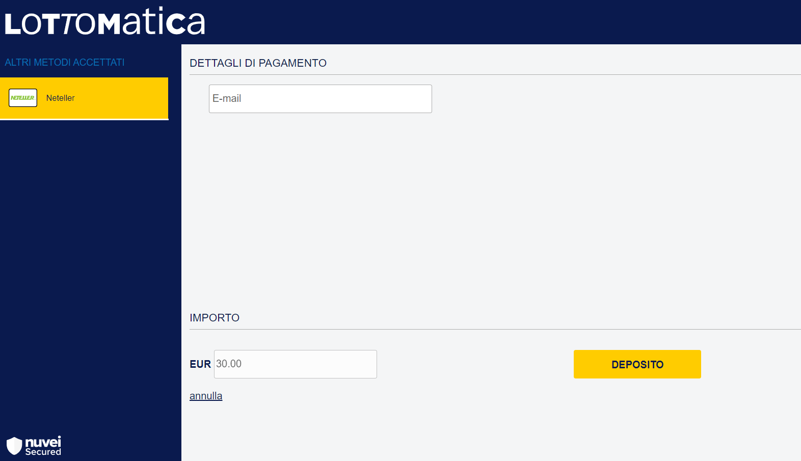 NOTA: l'inserimento dell'indirizzo e-mail associato all'account Neteller è richiesto al primo versamento. La schermata sopra riportata sarà mostrata per i depositi successivi al primo.