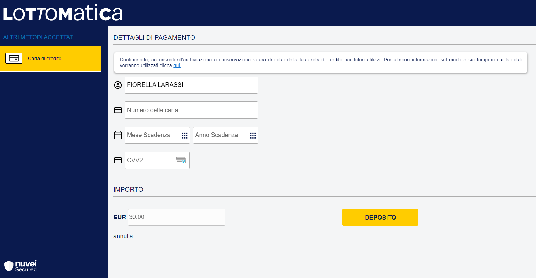 Ti appariranno nella schermata successiva tutti i metodi di deposito:
