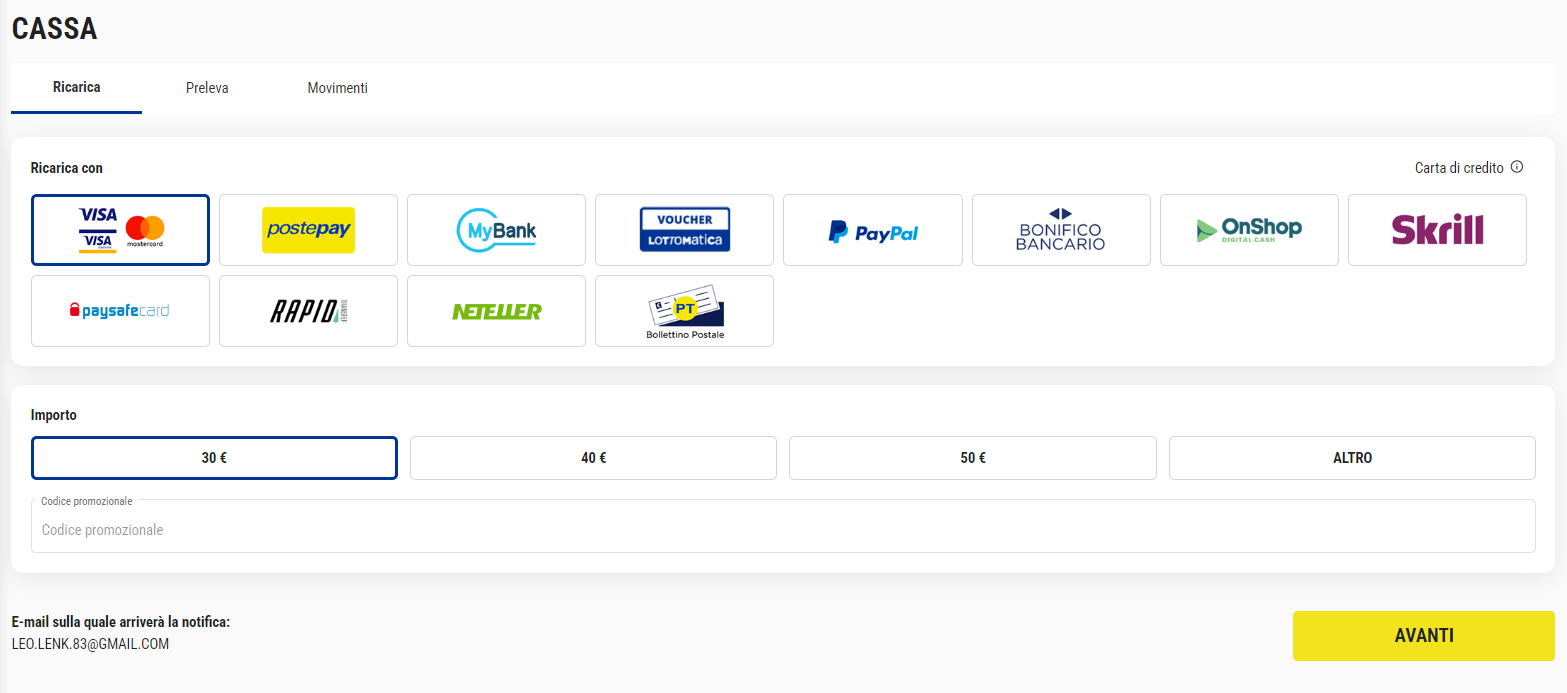 Nota bene: Gli utenti non verificati (il cui documento d’identità non è stato validato), hanno un limite massimo di deposito complessivo di 1.000 €. Una volta raggiunto questo limite è obbligatorio inviare il documento per poter depositare con qualsiasi metodo disponibile.