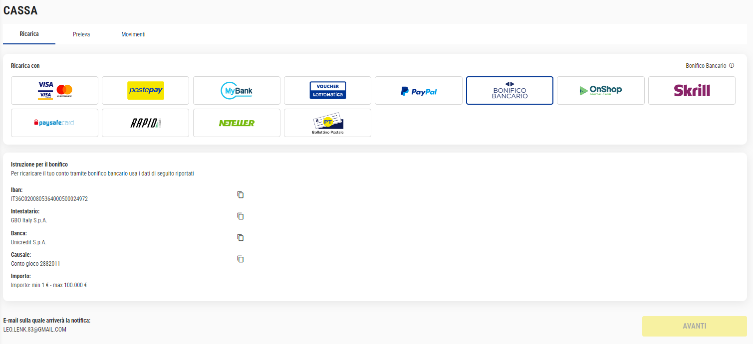 Puoi ricaricare il tuo Conto Gioco anche tramite la modalità di deposito: bonifico bancario.