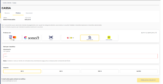 Tempistiche: L’accredito del prelievo bancario è generalmente immediato, dalla conferma indicata sui movimenti del Conto Gioco, SOLO se la banca è abilitata a questo servizio. Diversamente l’accredito del prelievo avverrà secondo le tempistiche del circuito interbancario.
