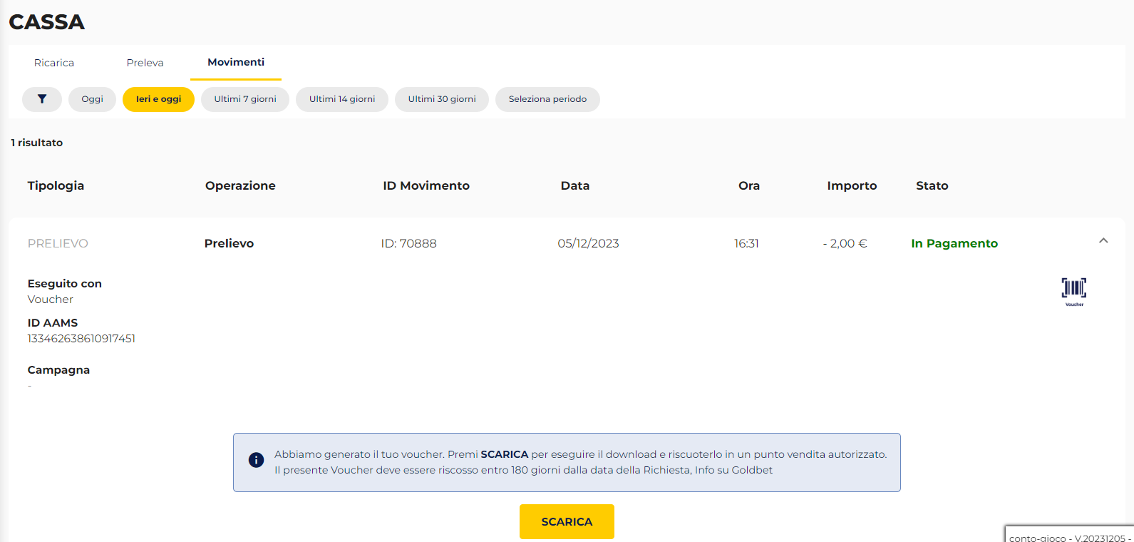 Selezionando la voce Movimenti potrai scaricare il Voucher da esibire presso un punto vendita Lottomatica per la riscossione in contanti, entro 180 giorni dalla data di emissione. La riscossione può avvenire presso qualsiasi Punto vendita.