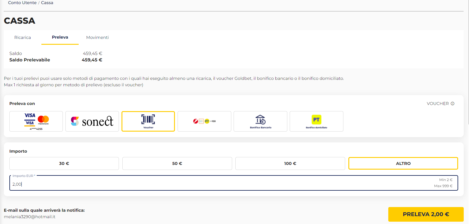 Il sistema mostrerà in automatico le opzioni di prelievo disponibili. Seleziona la voce Voucher e scegli l'importo desiderato: