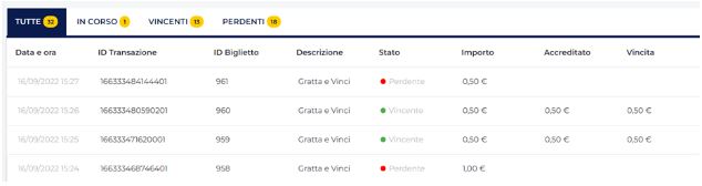 - In tal caso, per quanto possa contrariare non essere partecipante attivo dell’animazione dei G&V, in realtà non cambia nulla, in quanto l’esito del biglietto stesso è determinato da un ID a cui è associata la possibilità che esso sia perdente o vincente (ed il suo ammontare di vincita), pertanto basterà recarsi nella lista movimenti per verificare se è avvenuto un accredito di vincita o la transazione risulta perdente.