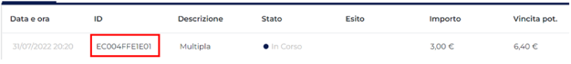 Appurato lo stato in corso con avvenimento presente sullo storico dei risultati del sito, sarà necessario reperire l’ID della giocata e riportarlo all’assistenza.