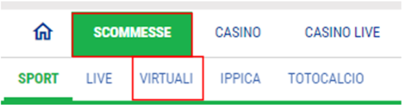 Per poter accedere alla sezione Virtual del sito bisogna recarsi nella sezione Scommesse➡Virtuali
