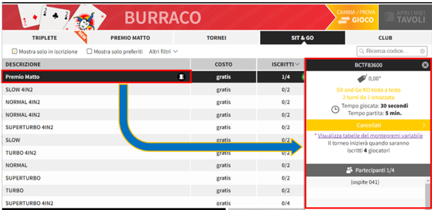 2. Cliccare sulla riga rispondente al torneo su cui si è iscritti➡Comparirà il pop up con il riassunto del torneo