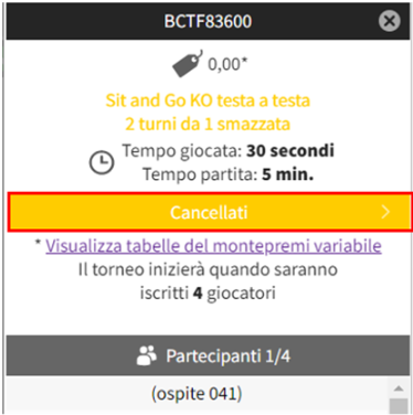 Per cancellare la registrazione ad un torneo (prima che inizi), è possibile seguire 2 operazioni