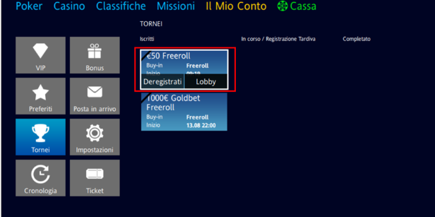 - Il torneo è consultabile anche nella sezione Il Mio Conto➡Tornei dove è possibile effettuare la stessa operazione di deregistrazione ed accesso alla lobby del tavolo