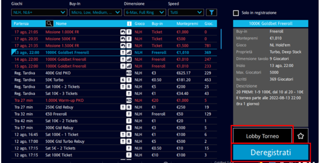 - Sarà possibile effettuare la de-registrazione in qualsiasi momento dopo la registrazione fino all’inizio del torneo cliccando su “Deregistrati”, oltre a poter accedere alla “Lobby Torneo” (ovvero info tavolo)