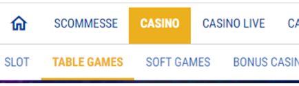 La sezione in cui trovare i Table Games è seguendo il percorso di tasti CASINO ➡TABLE GAMES