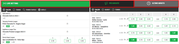 - Live (scommesse live su match in Corso in quel momento)