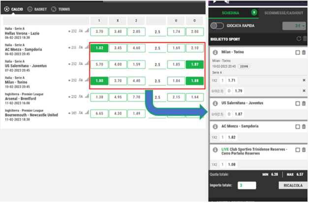 - Nel momento della selezione degli esiti per ogni avvenimento, sia esso live o ancora non iniziato, si andrà a popolare il biglietto
