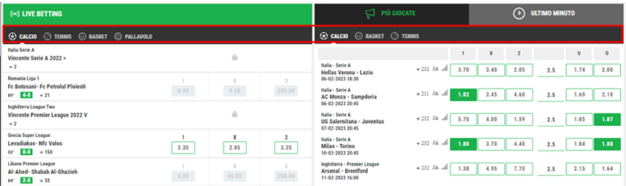 - Più giocate (avvenimenti pre-match)