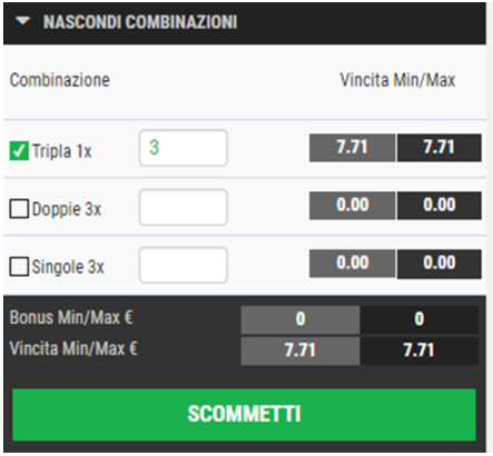 - Verranno mostrate tutte le possibili combinazioni di N-pla di biglietti generabili con il sistema e le loro rispettive quote e vincite potenziali in base all’importo inserito nel box