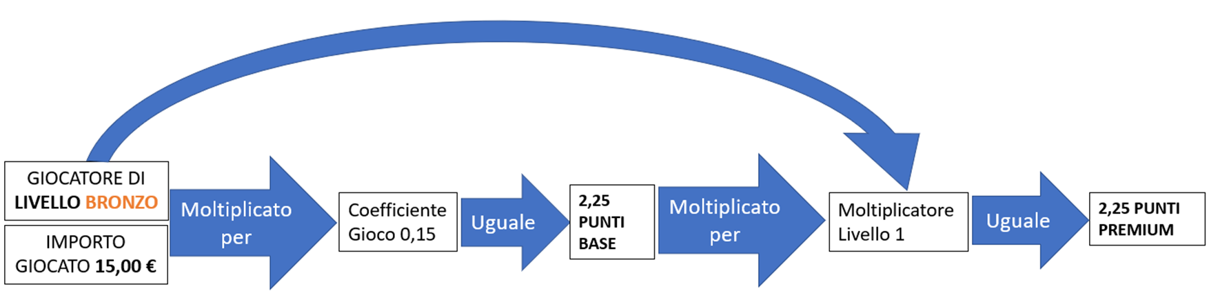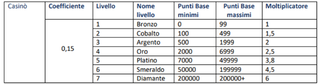 Esempio: giocando 15€ al Casinò si ottengono 2,25 Punti Base. Se ci si trova al livello Oro
