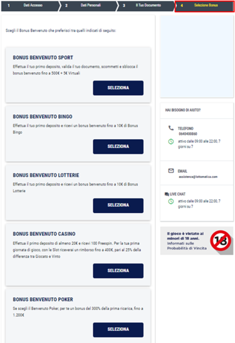 - Il bonus Benvenuto può essere selezionabile solo in fase di registrazione non a posteriori