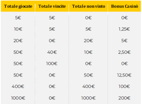 - Il bonus Benvenuto Casino implica il rimborso del 25 % delle giocate fino ad un massimo di 200,00 € (perdite nette del giorno) nel primo giorno di giocate Casino